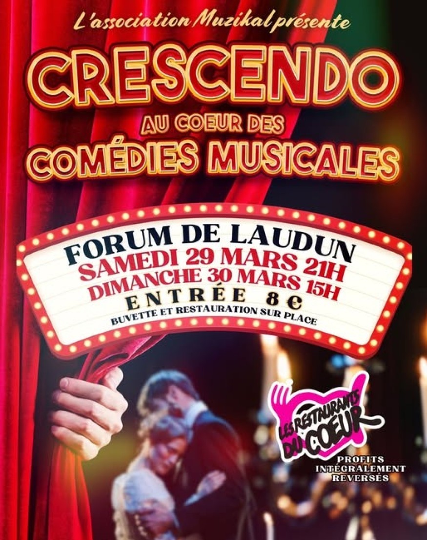 La troupe « Crescendo » présente son 17ème spectacle au profit des Restos du Cœur du Gard, « Crescendo au cœur des comédies musicales » au forum de Laudun ces samedis 29 mars à 21h et dimanche 30 mars à 15h. Accompagnés par les musiciens « Les No Name » en live, les 35 chanteurs amateurs de la troupe vous proposent un voyage au cœur des plus beaux titres des comédies musicales pendant 2 heures. Un spectacle qui vous fera vivre une soirée et un après-midi inoubliable entre voix puissantes et mise en scène soignée le tout dans une ambiance d'énergie et de partage.